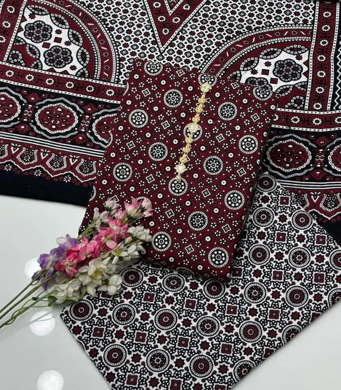 Elevate your ethnic wardrobe with this fully printed 3-piece Ajrak suit in rich maroon tones. Made from breathable cotton and adorned with traditional hand block prints across the shirt, dupatta, and shalwar — it delivers comfort without compromising on cultural elegance.