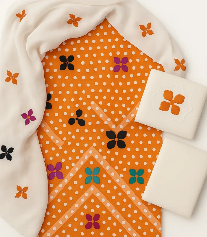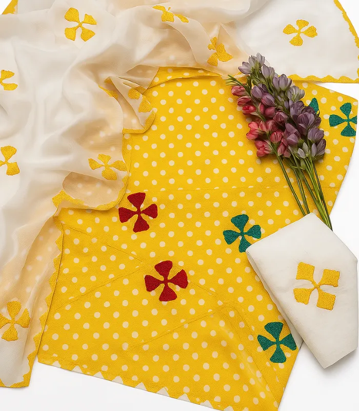 A graceful and colorful 3-piece applique cotton suit, designed in both Chunri and Goli prints. Each set includes a soft cotton shirt and shalwar, paired with a matching chiffon dupatta featuring detailed applique work. Available in a variety of vibrant colors including yellow, red, green, and more.