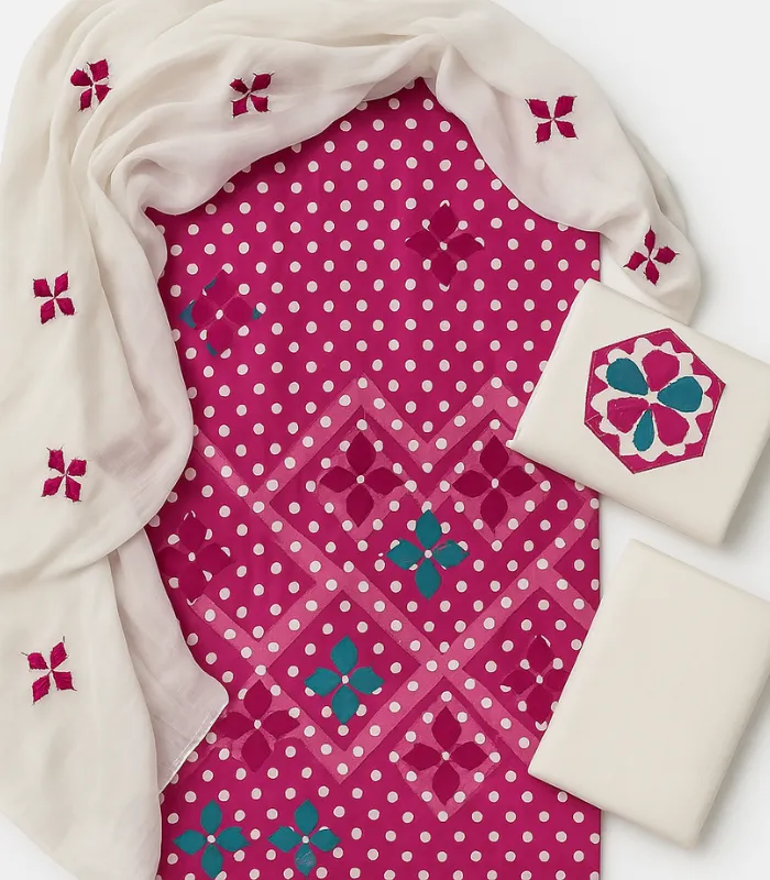 3-Piece Cotton Applique Suit with Chiffon Dupatta – Chunri & Goli Print